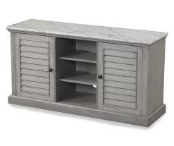 Relax and entertain in coastal chic design using this TV stand! The low profile design features storage behind beveled doors for all of your items and decorating needs. Finished in an oak woodgrain look, this TV stand makes a dynamic statement in your living room or an entertaining space.
