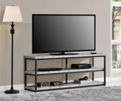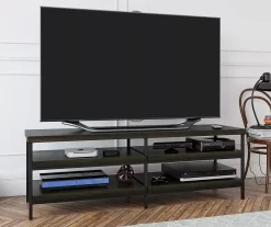 Versatile and beautiful, this highboy console will easily give any room in your home extra storage and flair. With a barn door style cabinet for concealed storage and spacious shelves to display your electronics or games, its asymmetrical design will complement your aesthetic while helping you organize your home in a way that feels just right. Woodgrain detailing featured on a durable laminate top, this TV stand is constructed with warp-resistant MDF. The modern farmhouse style of this entertainment center will give a rustic and charming accent to your living room while keeping your media and room essentials organized and neat.