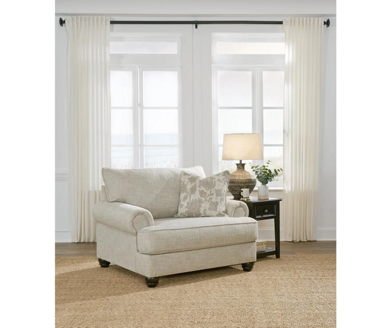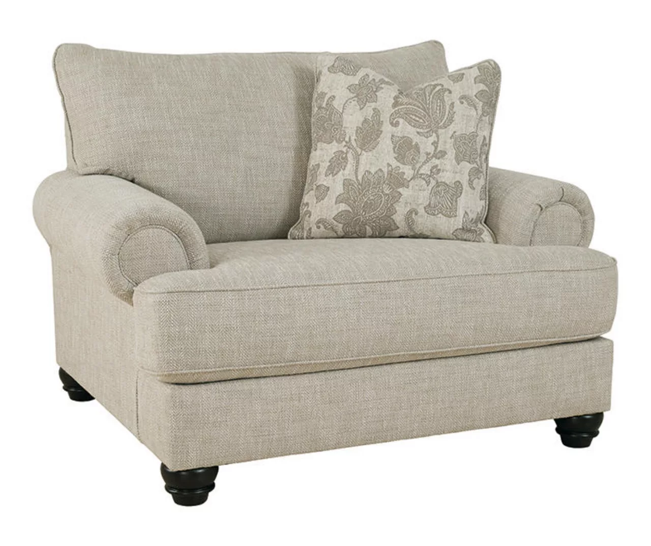 This oversized chair has an alluring look that’s guaranteed to turn heads. Richly textured fabric in a light, easy going hue is enhanced by even lighter flax peeking through. Distinctive roll arms add a dab of debonair, while indulgently plush cushions cradle you softly. Sit back and relax in comfort and style, with plenty of room to stretch out and unwind at the end of a long day.