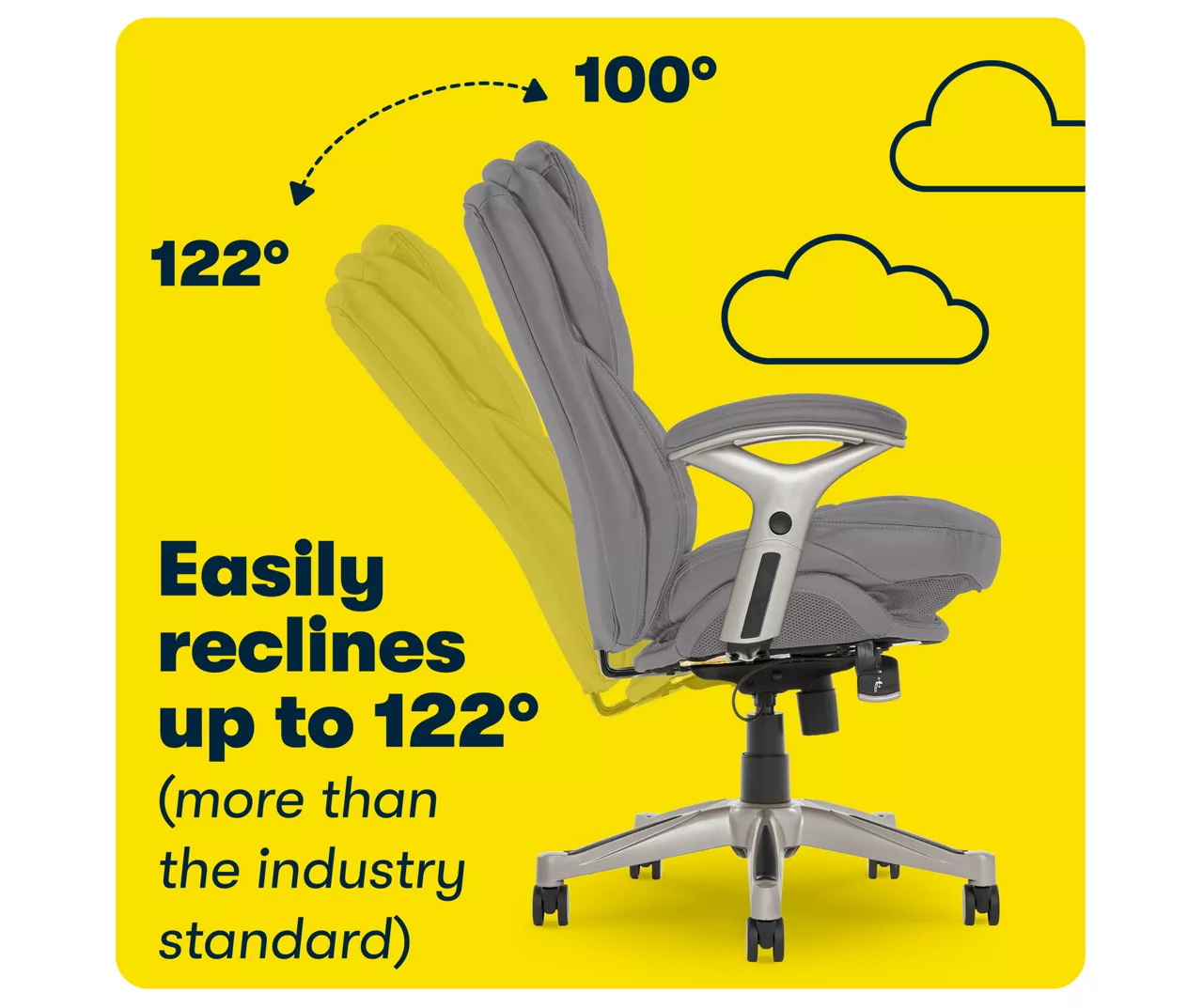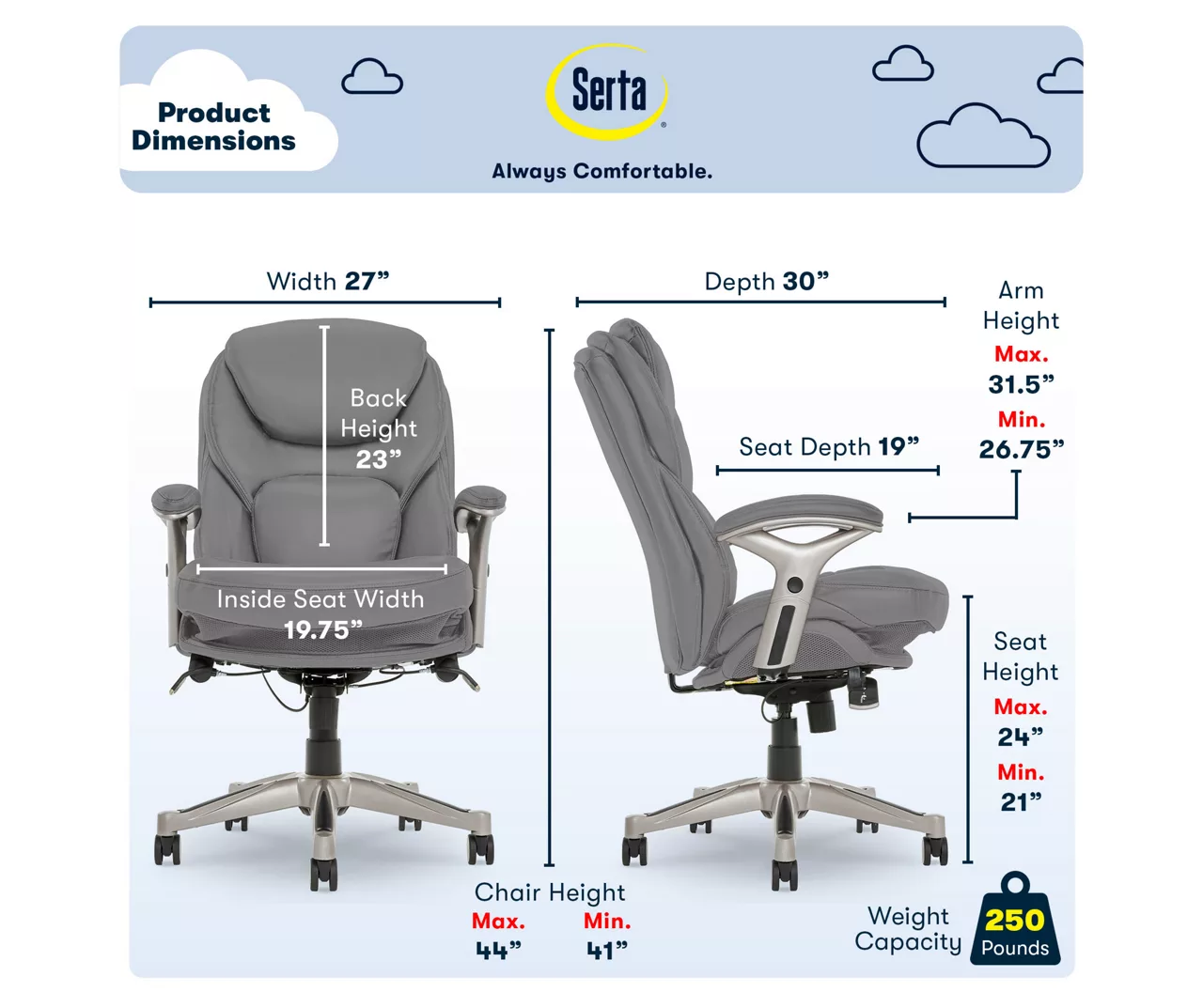 Help promote strength and flexibility in your back while you work with the Serta Back in Motion Executive Office Chair. This ergonomic office chair helps users become more productive and efficient by maximizing lower back support and comfort while seated. Its unique Back in Motion Active Seat Technology swivels the lumbar forward, providing the same effects as a pelvic tilt exercise by promoting spinal movement and flexibility in your core. Push-button adjustable armrests and pneumatic height adjustment allow the leather office chair to be quickly and easily customized to find the right fit for you. The multi-layered cushions are soft yet supportive, so you’ll feel refreshed even after a long day.