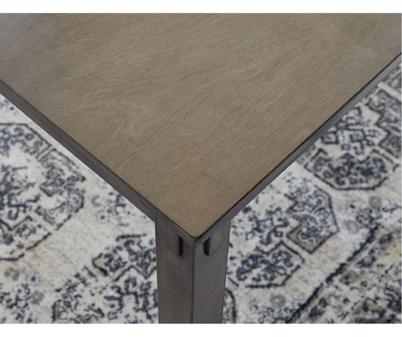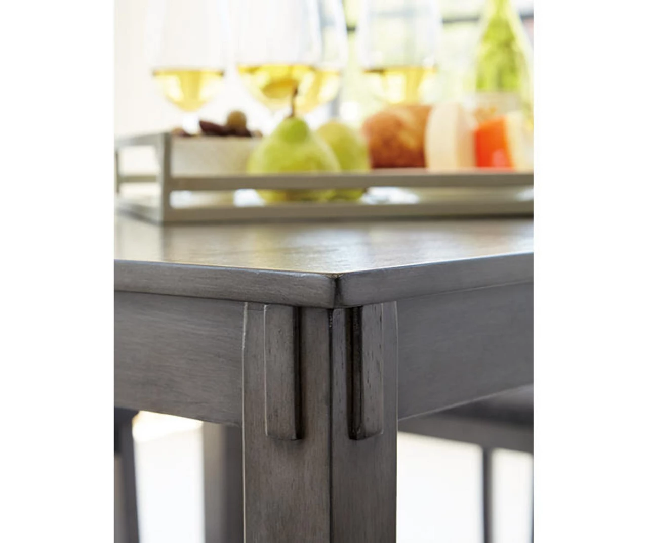 It’s so easy being gray – at least this five-piece dining set makes it seem that way. This transitional counter-height table and bar stool ensemble sports a charcoal gray finish with textured gray upholstery for an on-trend and relevant appeal. Plush upholstered seat cushions in a practical poly fiber make it a pleasure to linger at the table. Best of all, the square table design is ideally suited for small spaces.