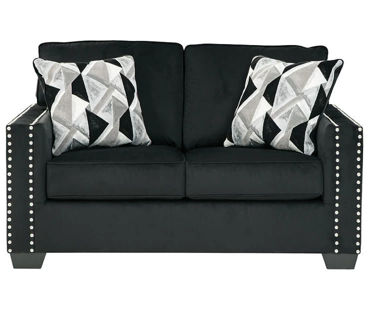 Raise your standard of living with the Gleston loveseat in onyx black. Reserved exclusively for those with a penchant for high-glam home decor, this ultra-chic loveseat is dressed to impress with a clean-lined profile, two-over-two cushion styling and sleek track arms punctuated with nailhead trim. Easy on the eyes and alluring to the touch, this decidedly contemporary loveseat is covered in a low-pile soft velvet that’s impossible to resist. Abstract-patterned throw pillows enhance the posh appeal.