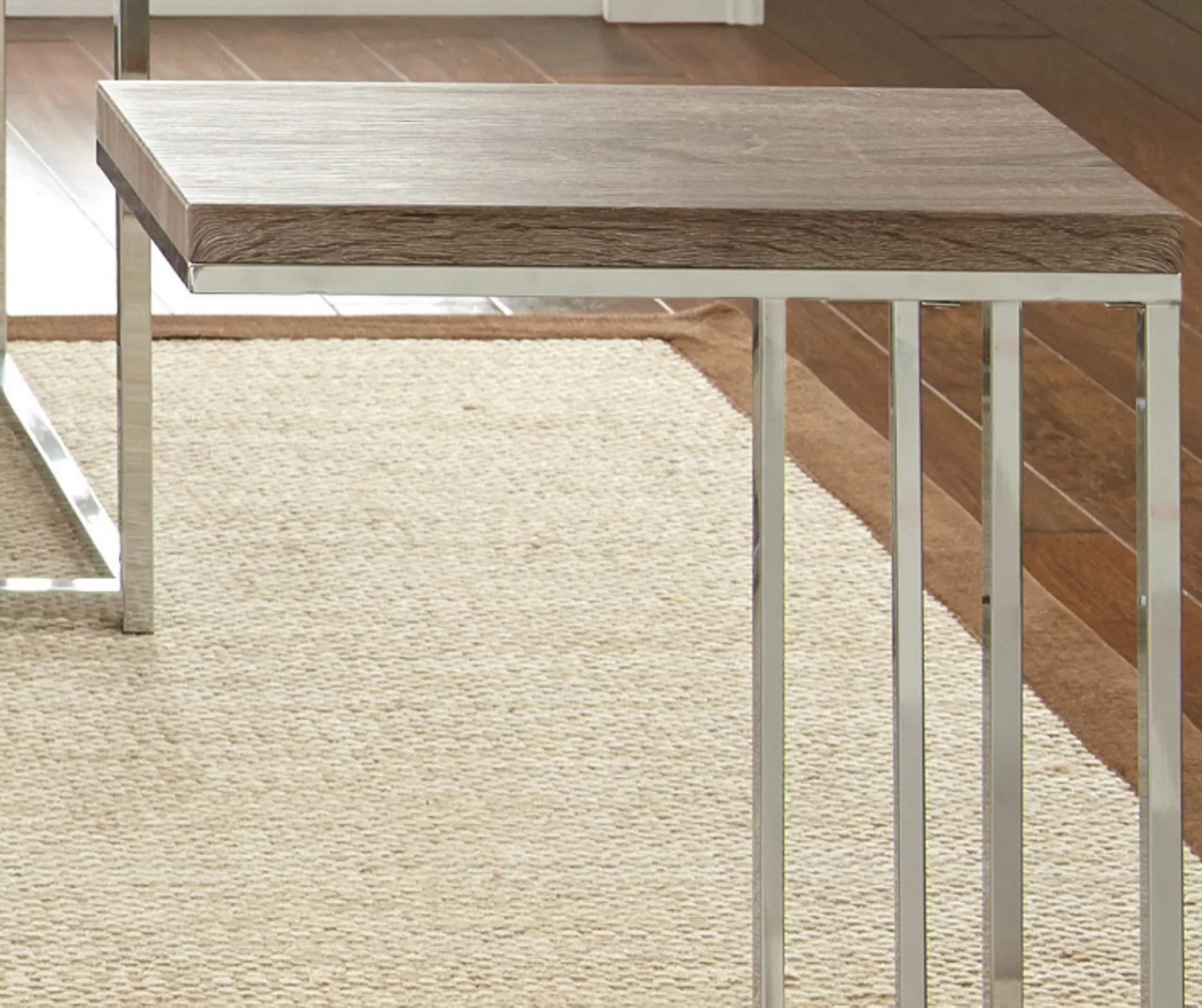 The modern Lucia chairside end table will add the finishing touch to your space. The tops and shelves are constructed of a durable Silvershield 3D PVC laminate that has the look of real wood grain and resists heat, moisture and scratches. Its sturdy chrome frame accents the beautiful light driftwood brown finish.