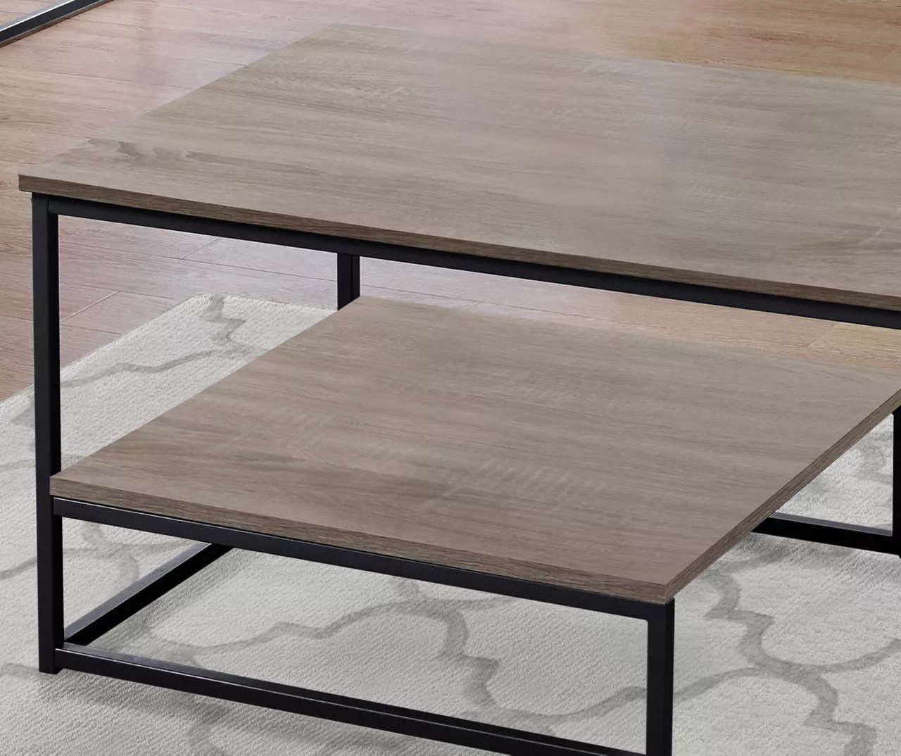 Bring a fresh modern update to your living space with this unique three piece coffee table set. The simple contemporary design in a warm, dark taupe laminated wood-look finish and black metal trim accent provides a spacious table top with a raised bottom half shelf for additional storage and display. The matching end tables are perfect to place a lamp, pictures, or other stylish decor while the coffee table will be an attractive focal point in your living room, den or family room.