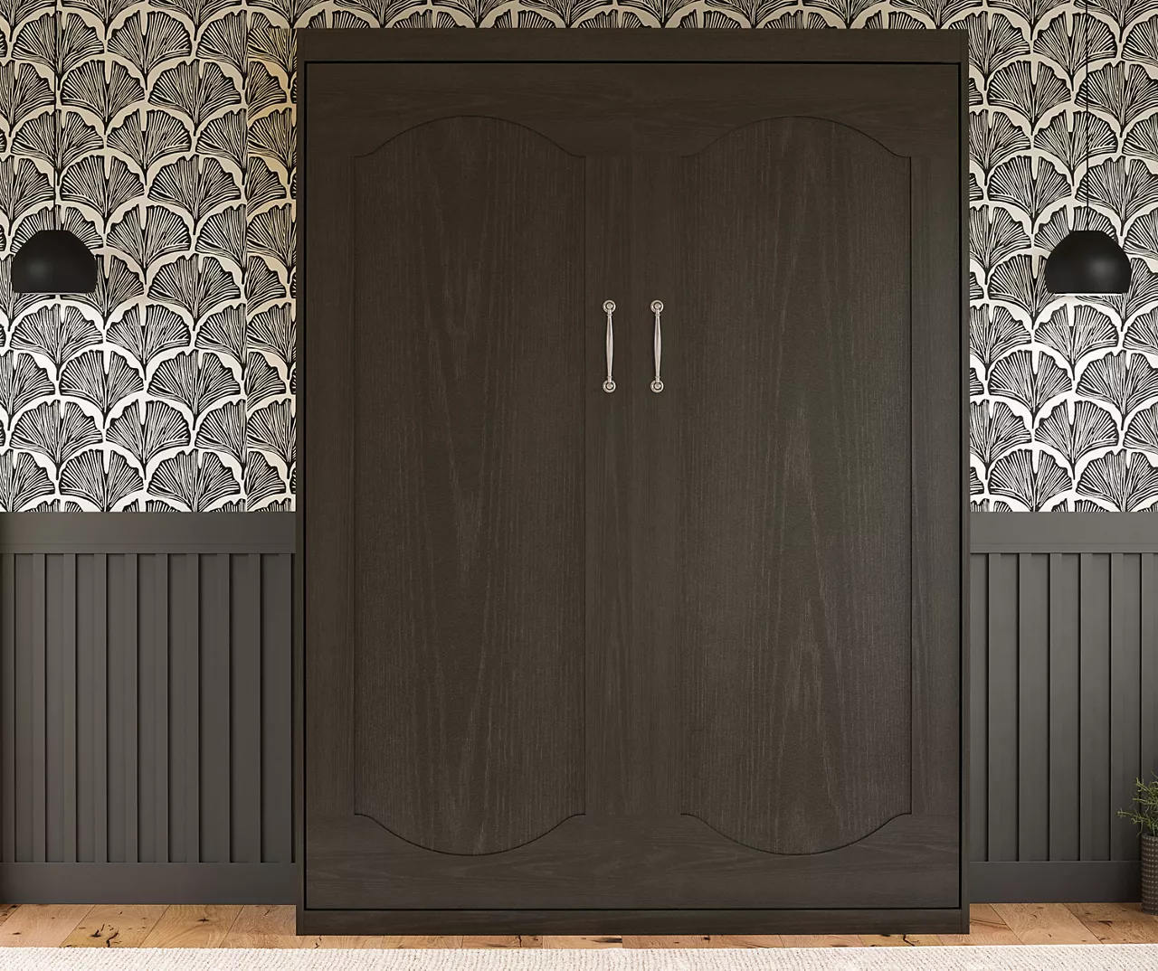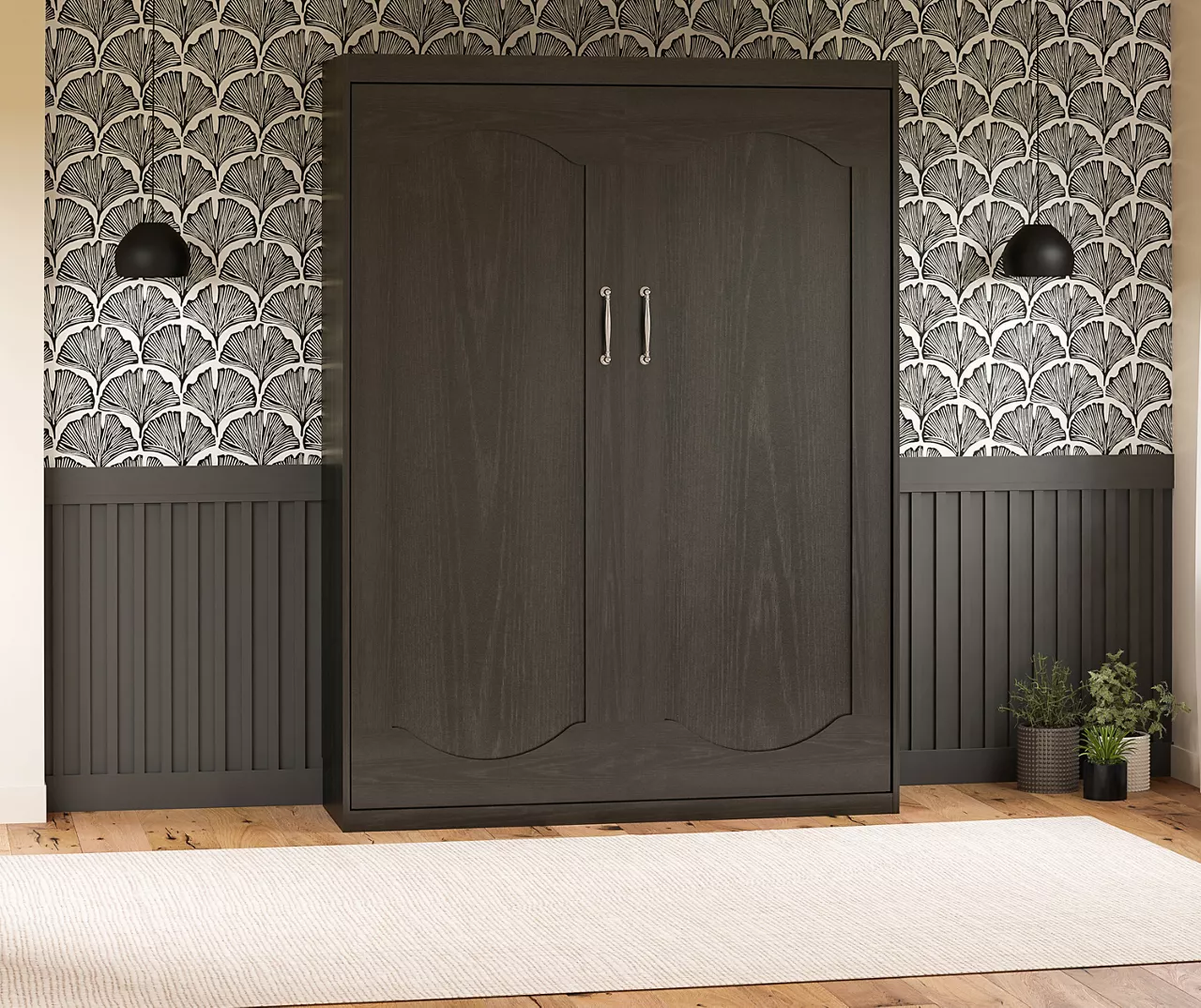 - Space-saving Murphey wall bed fits a full-size mattress up to 10″ thick