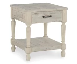 This rectangular end table charms your home with farmhouse style. White textural finish highlights the weatherworn feel of the wood tones and purposeful nail holes. Roomy drawer puts essentials out of sight as you display fashionable books or décor on the planked tabletop and bottom shelf. It’s a rustic-inspired addition to your living space.
