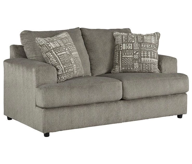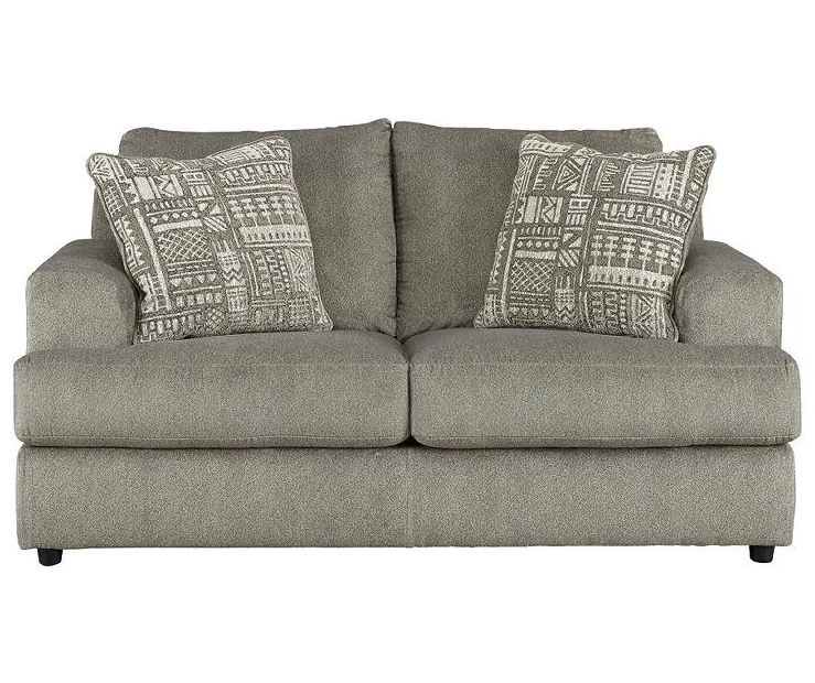 Flaunting a trendsetting silhouette, this loveseat puts the contemporary in your contemporary home. Its “three over two” profile eliminates the center seat cushion, giving you elongated plushness and deep seating. Microfiber fabric satisfies your need for a piece that feels as good as it looks. Accented with soft jacquard chenille throw pillows for a splash of geometric pattern and color contrast.